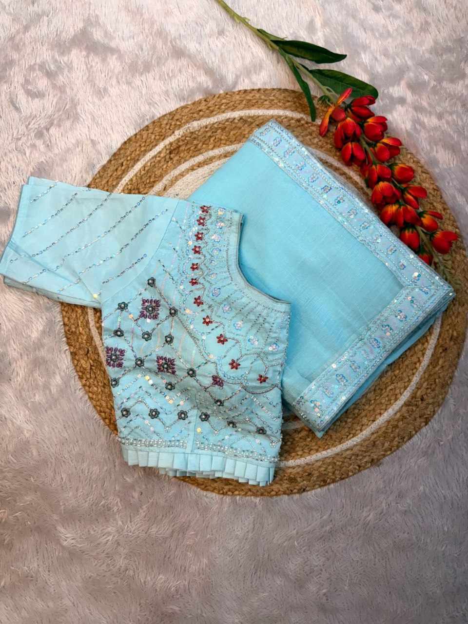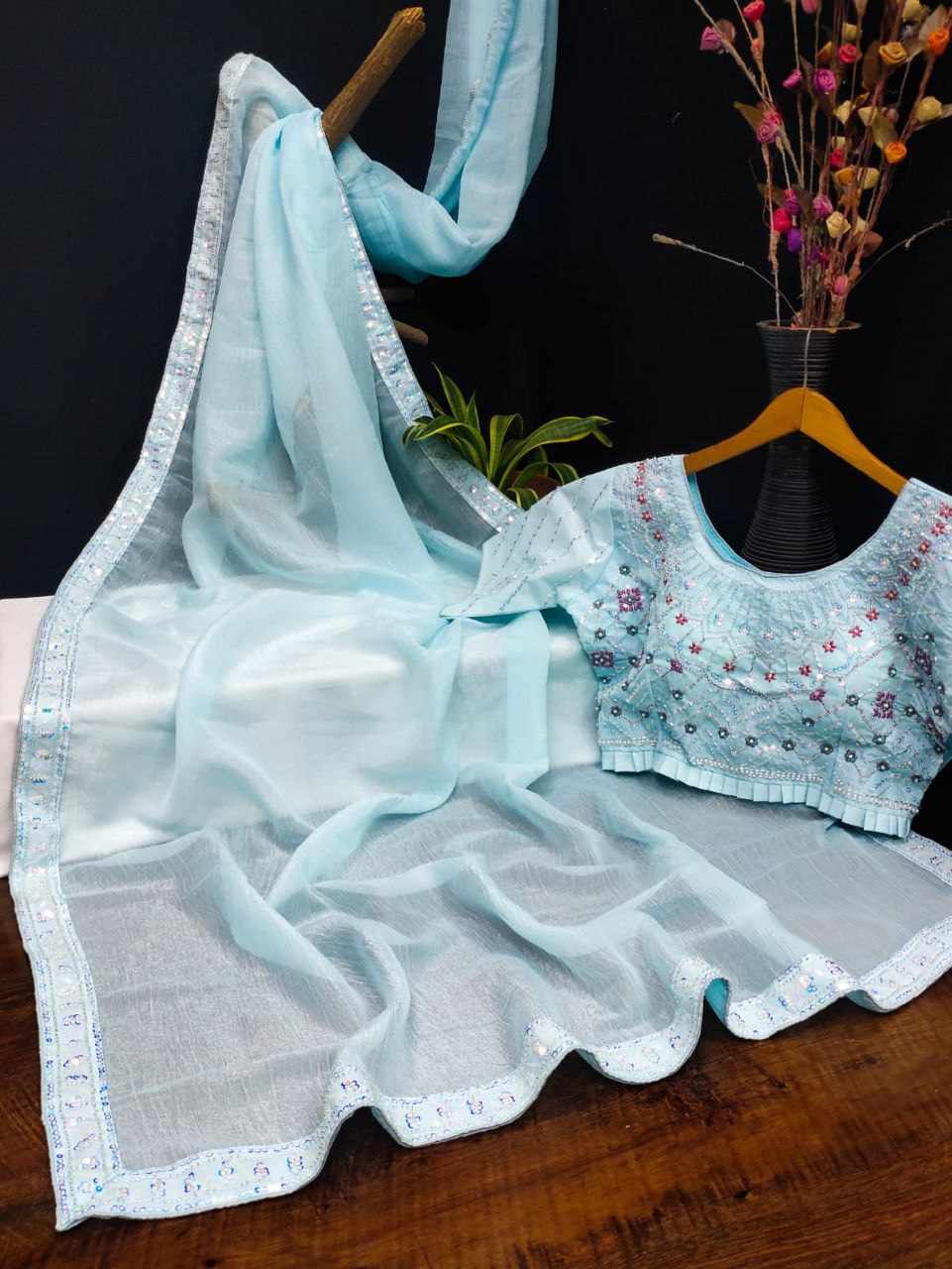 Saree Fabric: Beautiful crush shining saree with beautiful heavy handwork with beautiful rainbow sequins attached VALMOTI lace on the saree.